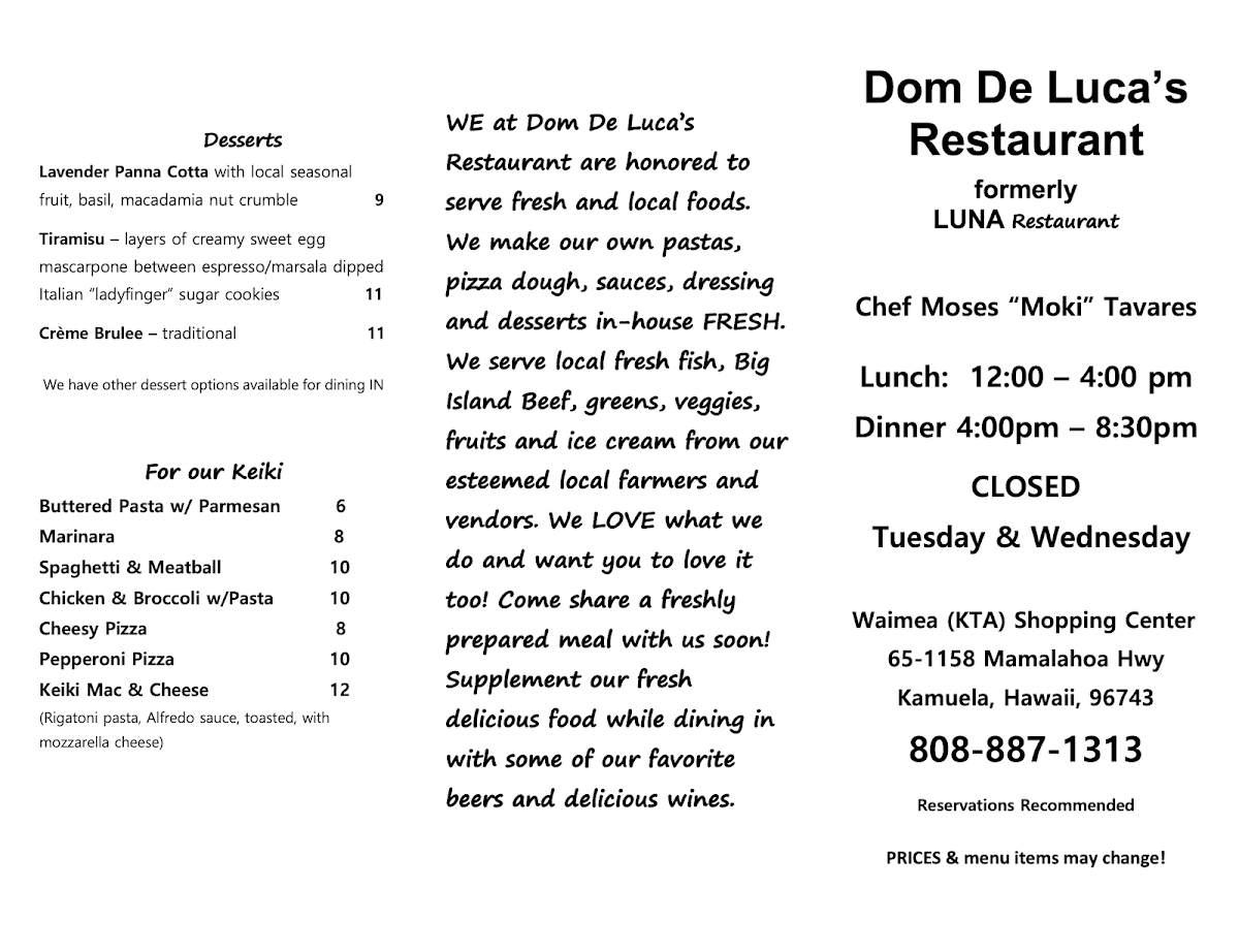 Welcome to Dom De Luca's Restaurant, where culinary artistry meets Hawaiian charm! Nestled along the scenic Mamalahoa Highway in Waimea, this eatery captivates with a menu that celebrates bold flavors and freshness. Renowned for their homemade pasta, each dish is crafted with love, evident in the rave reviews from delighted customers.